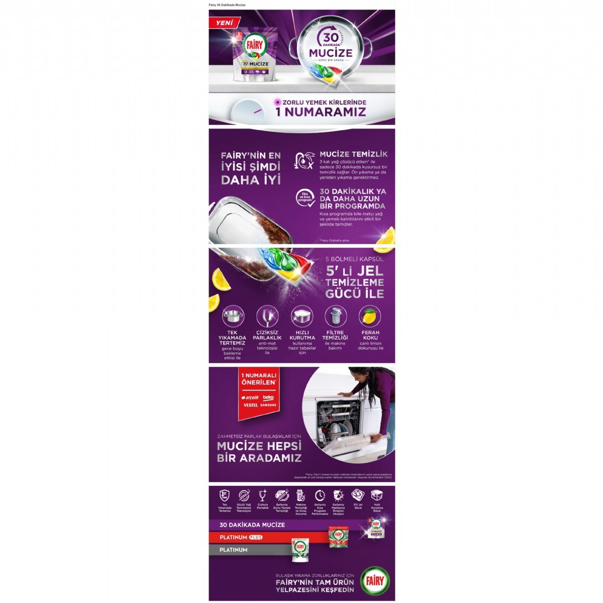 - Fairy 30 dakikada mucize, yeni 5 bölmeli kapsül teknolojisi ile zorlu yemek kirlerinde 1 numaramız.5'li jel temizleme gücü ile bulaşıklarınız tek yıkamada tertemiz olur.