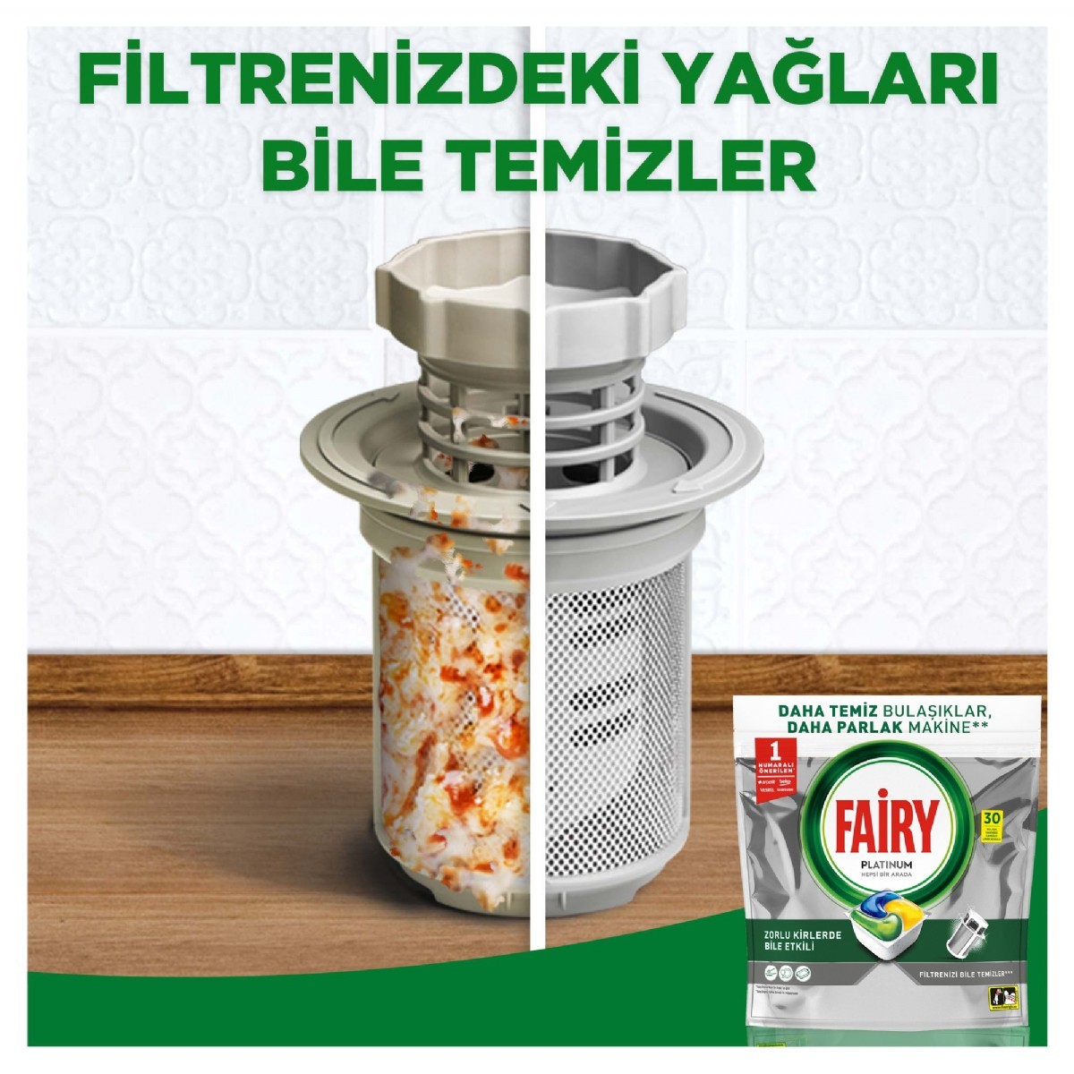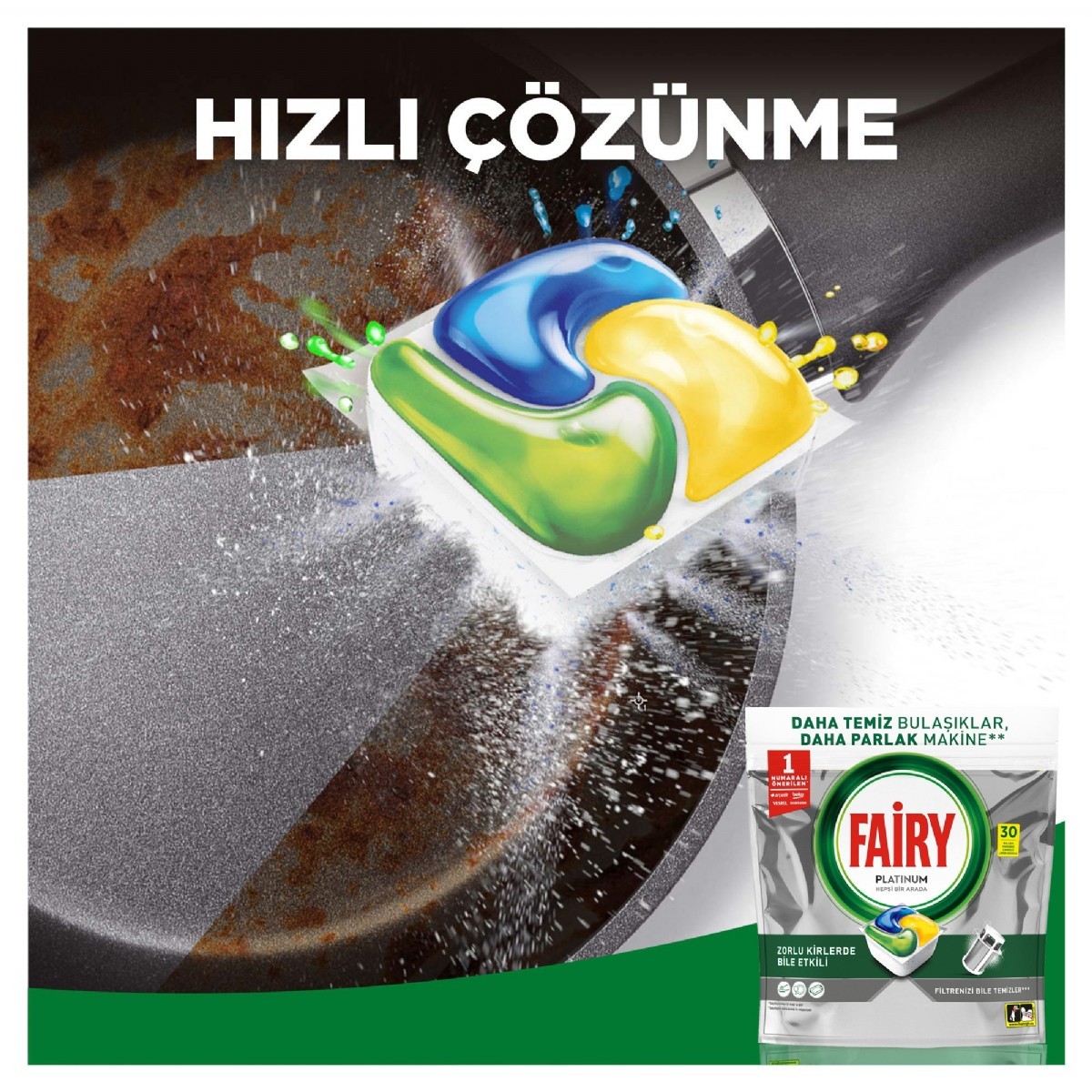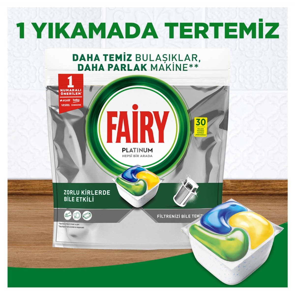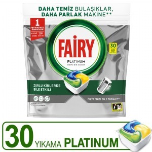 "Fairy Platinum hepsi bir arada bulaşık makinesi tabletleri ilk yıkamada temizlik etkisine sahiptir ve ışıldayan bulaşıklar için en inatçı kirleri bile çözer. Fairy Platinum'un temizleme gücü size istediÄŸiniz ÅŸeyi piÅŸirme güveni saÄŸlar, çünkü tertemiz bulaşıklar ve ferah bir bulaşık makinesi için yaÄŸlı filtrenizi bile temizleyeceÄŸini bilirsiniz. Fairy sıvı ve tozu tek bir güçlü kapsülde birleÅŸtirir. Kolay çözülen yapısı, hızla ayrışır ve iÅŸi bir an önce halletmek için temizlemeye hemen baÅŸlar. Üstelik kullanımı son derece kolaydır. Ambalajı açmaya gerek yok; ürünü bulaşık makinenizin deterjan bölümüne yerleÅŸtirmeniz yeterli.