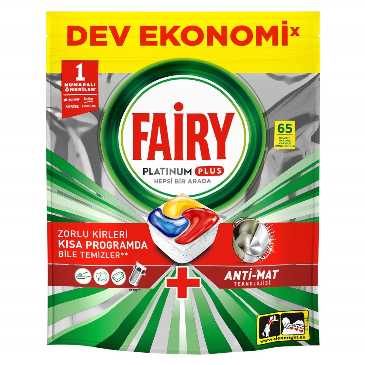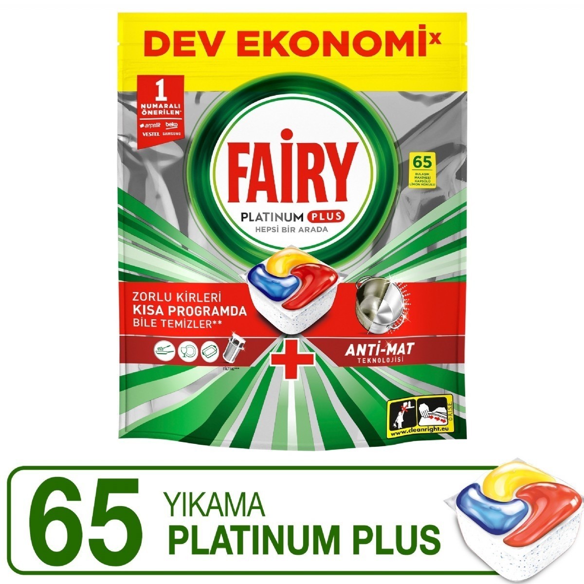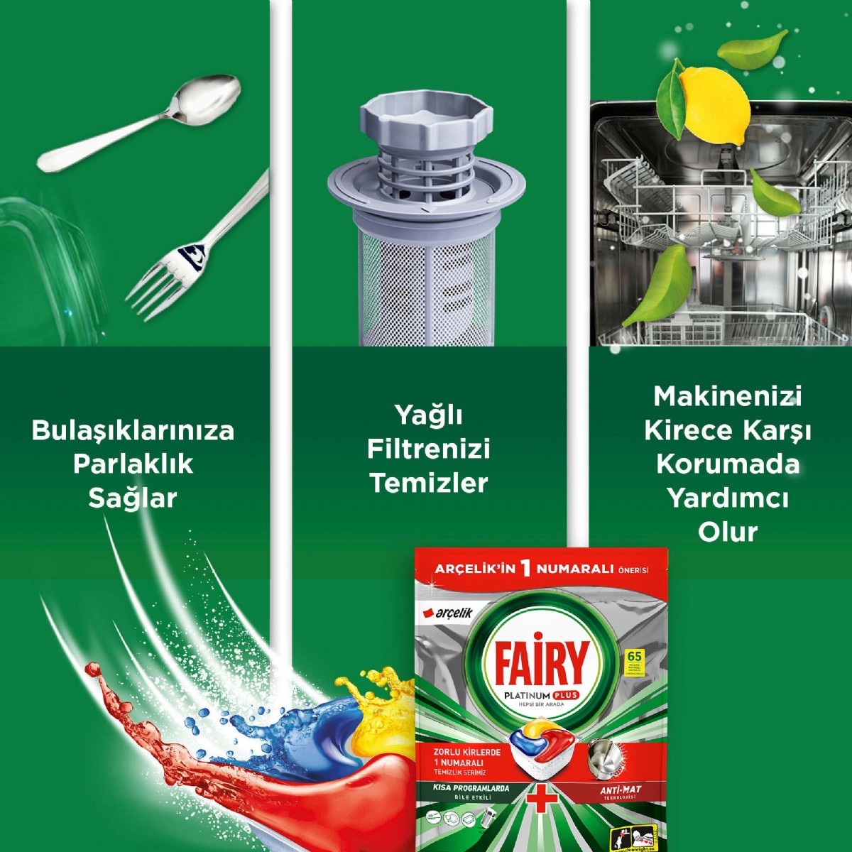 "Fairy Platinum hepsi bir arada bulaşık makinesi tabletleri ilk yıkamada temizlik etkisine sahiptir ve ışıldayan bulaşıklar için en inatçı kirleri bile çözer. Fairy Platinum'un temizleme gücü size istediÄŸiniz ÅŸeyi piÅŸirme güveni saÄŸlar, çünkü tertemiz bulaşıklar ve ferah bir bulaşık makinesi için yaÄŸlı filtrenizi bile temizleyeceÄŸini bilirsiniz. Fairy sıvı ve tozu tek bir güçlü kapsülde birleÅŸtirir. Kolay çözülen yapısı, hızla ayrışır ve iÅŸi bir an önce halletmek için temizlemeye hemen baÅŸlar. Üstelik kullanımı son derece kolaydır. Ambalajı açmaya gerek yok; ürünü bulaşık makinenizin deterjan bölümüne yerleÅŸtirmeniz yeterli.