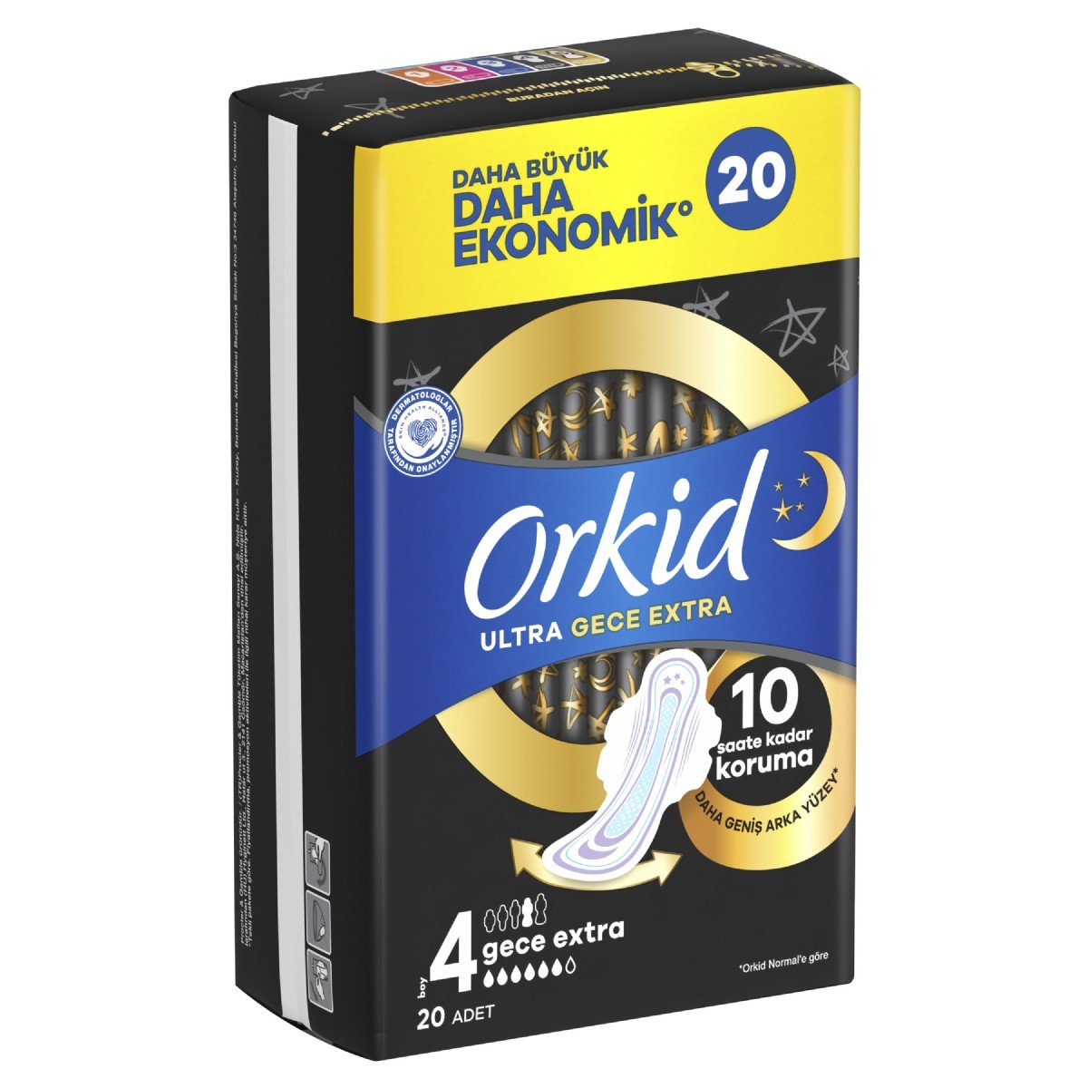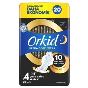 Kanatlı Orkid Ultra Gece Extra (boy 4) hijyenik pedler, gece boyu sızıntı olup olmadığını görmek veya pedinizi deÄŸiÅŸtirmek için uyanmanıza gerek bırakmayan, 3 adet koruma özelliÄŸi ile tasarlanmıştır.